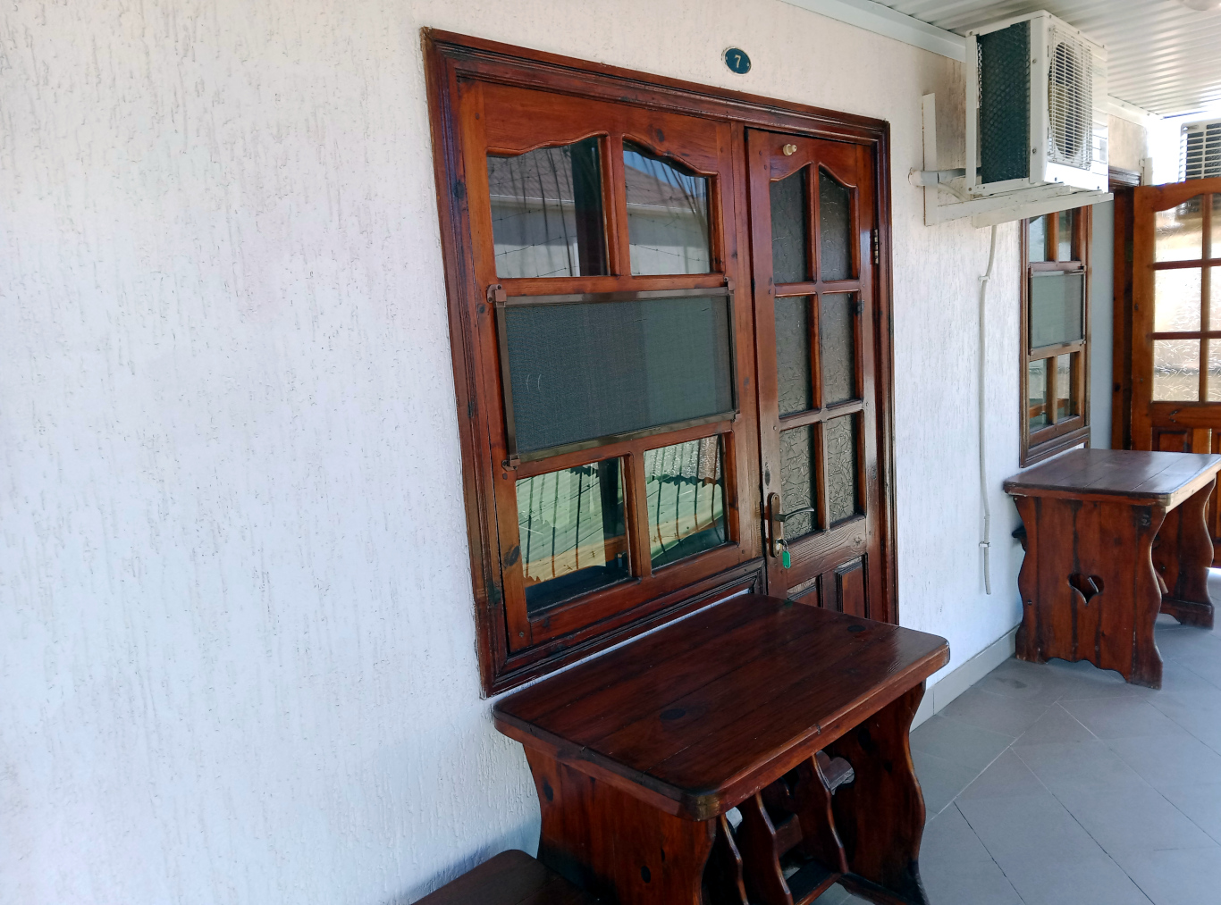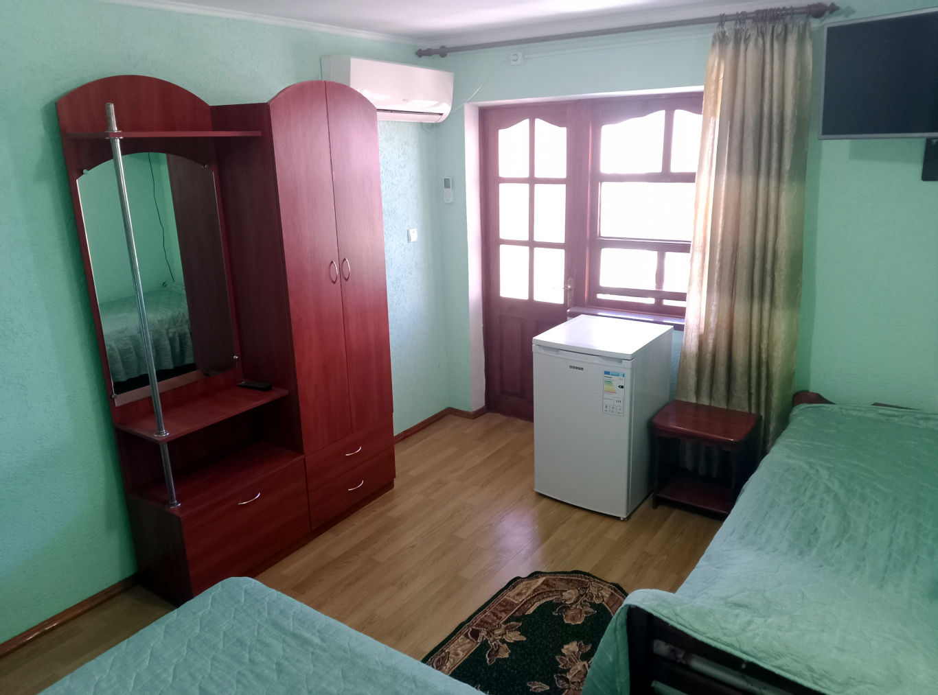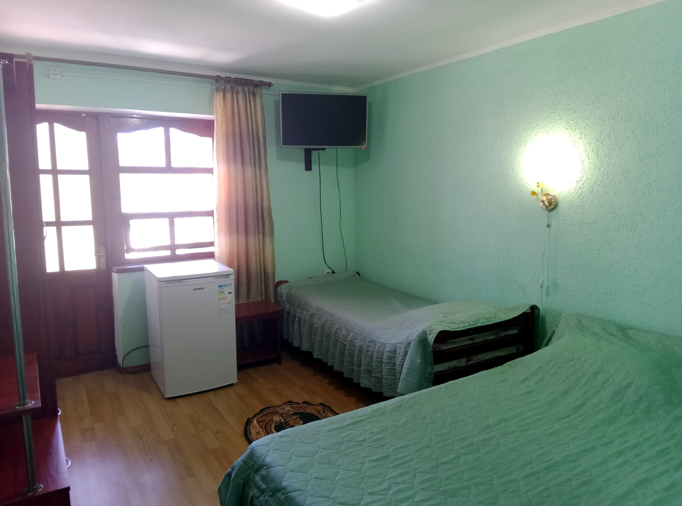 Мебель: Одна односпальная кровать (800х1900) и одна двуспальная кровать (1400х1900), шкаф с зеркалом, прикроватная тумбочка, коврики. Удобства: Кондиционер, телевизор, кабельное ТВ, холодильник, обеденный стол со стульями (на площадке возле каждой комнаты, можно принимать пищу на свежем воздухе) Ванная комната (в каждом номере): душ, унитаз, умывальник, шкафчик навесной с зеркалом, каждому гостю выдается полотенце (размер 80х50 см). Вода холодная-горячая постоянно.