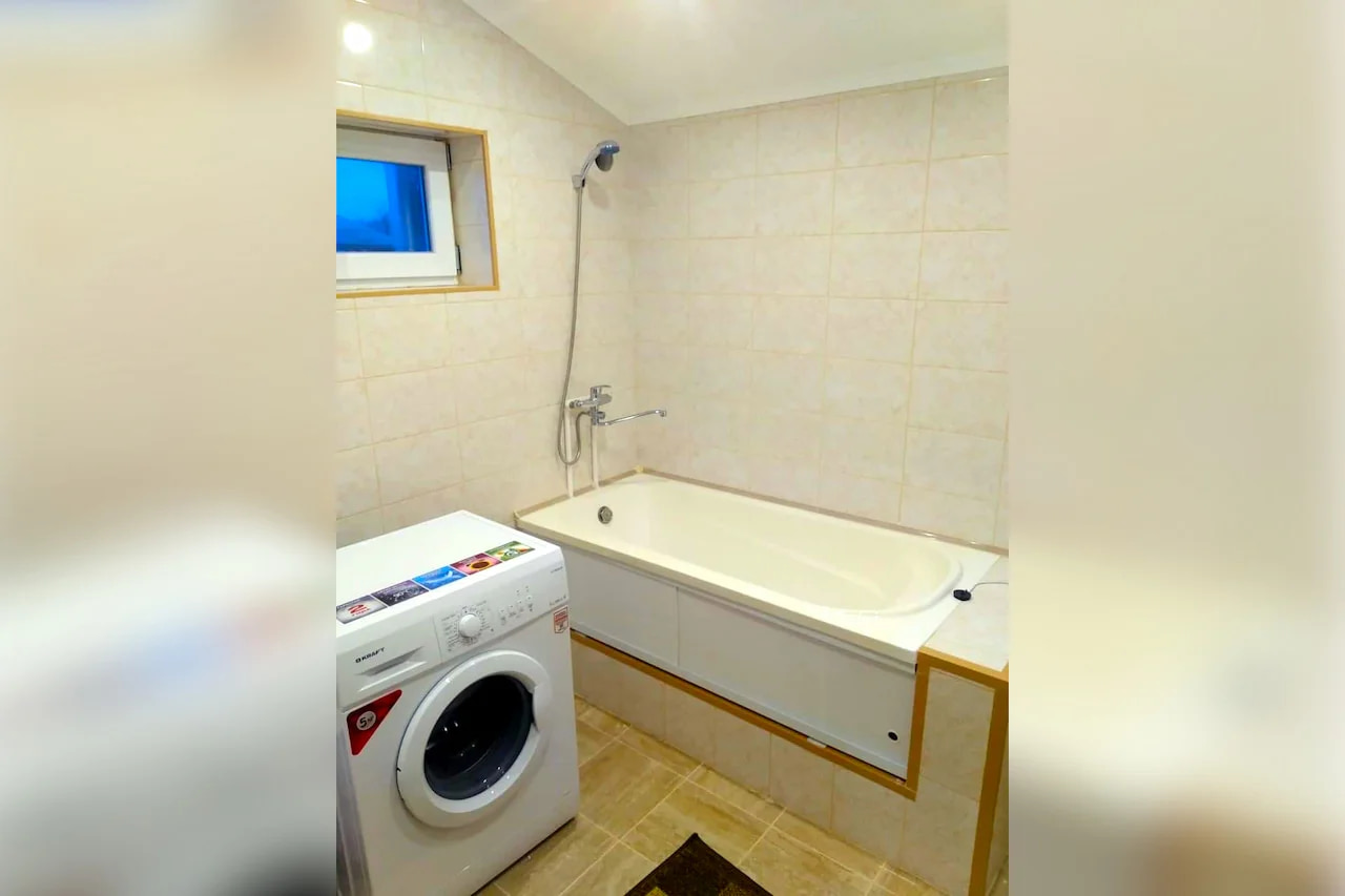 Мебель и Техника: В спальне двуспальная кровать (1600х2000), комод, шкаф с зеркалом, две прикроватные тумбочки, коврики, телевизор, кабельное ТВ, небольшой детский диванчик. Постельное белье, полотенца на каждого гостя по два (одно 140х80 и одно 90х50), пледы на каждого гостя. Кондиционер. На окне жалюзи. Кухня: На кухне - кухонный гарнитур, плита газовая четырехконфорочная с духовкой (над плитой установлена вытяжка), холодильник двухкамерный с морозильной камерой внизу LD, стол, стулья, микроволновая печь, чайник, диван 1400х2000. Посуда в наличии для приема и приготовления пищи. На окне жалюзи. Ванная комната: В Ванной комнате - ванна, умывальник, навесной шкафчик с зеркалом, унитаз, стиральная машинка, фен, утюг, гладильная доска, шушилка для белья. Прихожая: Прихожая - шкаф. В квартире интернет. Кабельное телевиденье. Вода холодная-горячая постоянно.
